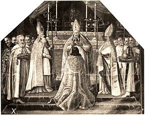 Inside the church, the Polish regalia were laid on the high altar, while the king was seated on a low chair nearby. The royal oath was administered, and the new monarch then knelt before the altar. Two mitred abbots next entered from a side chapel, carrying a mixture of holy oils, with which the ruler was then anointed. Following this, the king was handed a sword, which he used to trace a cross in the air. Next he was crowned by the Archbishop, assisted by two other bishops, following which he received his orb and scepter. The high mass continued, with the newly crowned sovereign receiving Holy Communion, then kissing a crucifix and mounting his throne. Following this, the king created several new knights, then attended a coronation feast and rode into the public square on horseback, where he received the homage of his subjects while seated in a large chair.[4]