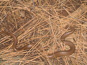 Characteristics of rubber boas behavior also set them apart from other snakes. Rubber boas are considered one of the most docile of the boa species and are often used to help people overcome their fear of snakes.[7] Rubber boas are known to never strike at or bite a human under any circumstances but will release a potent musk from their vent if they feel threatened. They are primarily nocturnal and likely crepuscular (active during dawn and dusk) which partially contributes to how rarely they are encountered. Because of the temperate regions they inhabit, rubber boas hibernate during the winter months in underground dens.