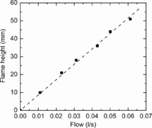 Since the time averaged pressure is equal at all points of the tube, it is not straightforward to explain the different flame heights. The flame height is proportional to the gas flow as shown in the figure. Based on Bernoulli's principle, the gas flow is proportional to the square root of the pressure difference between the inside and outside of the tube. This is shown in the figure for a tube without standing sound wave. Based on this argument, the flame height depends non-linearly on the local, time-dependent pressure. The time average of the flow is reduced at the points with oscillating pressure and thus flames are lower.[1]