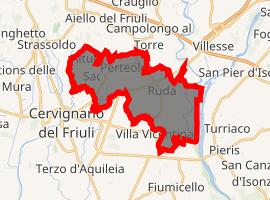Ruda borders the following municipalities: Aiello del Friuli, Campolongo al Torre, Cervignano del Friuli, Fiumicello Villa Vicentina, San Pier d'Isonzo, Turriaco, Villesse.