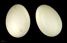 A clutch of about eight eggs (range six to twelve) is laid between late April and early June. These have a dull gloss and are creamy-white, averaging 68 by 47 mm (2.68 by 1.85 in). Incubation is done by the female while the male stands in attendance nearby. The eggs hatch after about twenty-eight days and both parents care for the young, which fledge in a further fifty-five days.[7] After breeding the adults moult, losing the power of flight for about a month while they do so. Before moulting they move to large water bodies where they can more easily avoid predation while they are flightless.[13] The family may stay together as a group for some time; the autumn migration starts around September and the young may mature in their second year. North African birds breed about five weeks earlier, and their breeding success is greater in wet summers.[7]