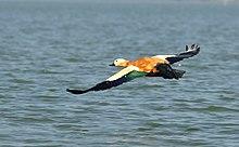 There are very small resident populations of this species in north west Africa and Ethiopia, but the main breeding area of the bird is from southeast Europe across the Palearctic to Lake Baikal, Mongolia, and western China.[10] Eastern populations are mostly migratory, wintering in the Indian subcontinent.[11] This species has colonised the island of Fuerteventura in the Canary Islands, first breeding there in 1994, and reaching a population of almost fifty pairs by 2008.[12] The ruddy shelduck is a common winter visitor in India where it arrives by October and departs by April. Its typical breeding habitat is large wetlands and rivers with mud flats and shingle banks, and it is found in large numbers on lakes and reservoirs. It breeds in high altitude lakes and swamps in Jammu and Kashmir.[11] Outside the breeding season it prefers lowland streams, sluggish rivers, ponds, flooded grassland, marshes and brackish lagoons.[13]