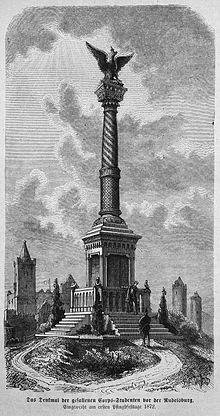 In 1872, the first monument erected by members of the students’ corps was unveiled. The Gefallenensäule (English: Pillar to the Fallen) was established in honour of those members who had fallen in the Franco-Prussian War. The Emperor William I Obelisk was unveiled in 1890, followed in 1896 by the Young Bismarck Memorial. The last of this first round of monuments was erected in 1926 in honour of those who fell in World War I.