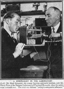 In 1929, Schneider took part in a number of experiments conducted by notable investigator/debunker Harry Price at the National Laboratory of Psychical Research. Price conducted a series of experiments in which Schneider was connected to a series of pressure switches that would alert observers if he moved his hands, feet or limbs in any significant way. Schneider was also physically restrained during some of the experiments.[4] Price recorded that during his experiments various phenomena were observed; including the movement of objects placed around the room and the apparent manifestation of mysterious hands and shapes.[4]