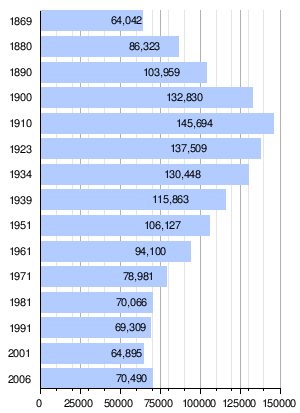 In 1869, the current area covered by the Rudolfsheim-Fünfhaus district already included 64,042 inhabitants, and it was similarly densely populated as it is today. Through the continuous influx of people into the area, the population increased until the beginning of World War I, and had doubled by 1910 at the peak of 145,694 people. Afterwards, a permanent population decline occurred, which was mainly due to higher housing claims. After a historic low of 64,895 inhabitants in 2001, the district population trended to re-grow. Only after the turn of the millennium, did the population in Vienna citywide tend to grow. At the beginning of 2007, the population stood at 70,490 people in Rudolfsheim-Fünfhaus.