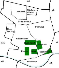 Over time, the district was extended in addition to parts of Gaudenzdorf (between Wienzeile and Diefenbachgasse) and Penzing (between Hollergasse and Winckelmann Street). Sechshaus is located in the southeast between Hollergasse, Sechshauser Straße and Diefenbachgasse. Rudolfsheim is located in the southwest area of the district, Fünfhaus east of it, the origin was in the area Clementinengasse on a path between Gumpendorf and Schmelz. The border between Rudolfsheim and Fünfhaus run along the line Pouthongasse - Schmelzbrücken Ramp - Grenzgasse - Geibelgasse. Originally, Fünfhaus included the area between Mariahilfer Straße, Kenyongasse, and Wimbergergasse Burggasse, but it was released in 1907 on new construction.