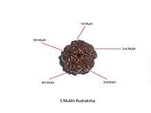 Rudraksha (IAST:Rudrākṣa) is a seed that is used as a prayer bead in Hinduism (especially in Shaivism).[1] When they are ripe, rudraksha seeds are covered by a blue outer fruit and are sometimes called blueberry beads.[2] The seeds are produced by several species of large, evergreen, broad-leaved tree in the genus Elaeocarpus, the principle of which is Elaeocarpus ganitrus.[3] The seeds are associated with the Hindu Lord Shiva and are commonly worn for protection and for chanting mantras such as Om Namah Shivaya (Devanagari: ॐ नमः शिवाय; IAST: Om Namaḥ Śivāya). The seeds are primarily sourced from India, Indonesia and Nepal for jewellery and malas; they are valued similarly to semi-precious stones. Various meanings and interpretations are attributed to the beads with different numbers of segments or the locules of seed (mukh) [Sanskrit "मुख": face ], and rare or unique beads are highly prized and valuable.
