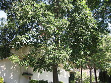Elaeocarpus ganitrus trees grow to 60–80 ft (18–24 m) and are found from the Gangetic plain in the foothills of the Himalayas to Nepal, South and Southeast Asia, parts of Australia, and Guam and Hawaii.[10] Of the 300 species of Elaeocarpus, 35 are found in India.[11] It is an evergreen tree that grows quickly. The rudraksha tree starts bearing fruit in three to four years from germination. As the tree matures, the roots form buttresses, rising up near the trunk and radiating out along the surface of the ground.