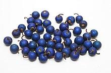 Rudraksha seeds are covered with a blue outer husk when fully ripe and are also known as blueberry beads. The blue color is not derived from pigment but is structural.[13]