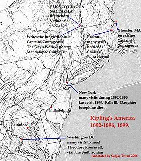 Starting his American travels in San Francisco, Kipling journeyed north to Portland, Oregon; to Seattle, Washington; up into Canada, to Victoria and Vancouver, British Columbia, through Medicine Hat, Alberta; back into the US to Yellowstone National Park; down to Salt Lake City; then east to Omaha, Nebraska, and on to Chicago, Illinois; then to Beaver, Pennsylvania on the Ohio River to visit the Hill family; from there, he went to Chautauqua with Professor Hill, and later to Niagara Falls, Toronto, Washington, D.C., New York, and Boston.[33]