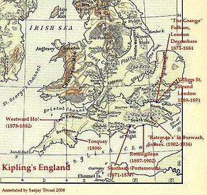 By September 1896, the Kiplings were in Torquay, Devon, on the southwestern coast of England, in a hillside home overlooking the English Channel. Although Kipling did not much care for his new house, whose design, he claimed, left its occupants feeling dispirited and gloomy, he managed to remain productive and socially active.[16]