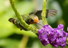 Coquette hummingbirds exhibit a distinctive vertical pumping of their tails when in flight. This pumping motion gives the birds an insect-like appearance, and often results in them being mistaken for sphinx moths, which share similar habitats and body sizes to the hummingbirds.[4]