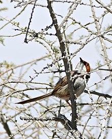 The rufous-eared warbler is a small passerine bird that gets its name from its distinct rufous-coloured ear-patches. The head and rear of the neck are brown and streaked with dark red while the belly and neck are greyish white, with a variable black breast-band that is absent from adults during winter.[2] The mantle and back are mottled with greyish brown and blackish brown. The eyes are described as reddish hazel,[2] with pinkish legs and a black bill measuring 11–13 mm.[2] The tail is long and thin, and is often held upright over the body.[10] The tail is made up of a total of 10 paired tail feathers, with the outer feathers up to 5.6 cm shorter than the central tail feathers.[2][5] The birds are small, measuring around 15 cm in length with males weighing 10-12 g and females weighing 9-11 g.[3]
