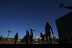 Despite Japan's vast playing resources, it has a major problem in the lack of pitches, since Japan is highly urbanised and land is at a premium in the country.[8] This sometimes results in a pitch being used for games from 6 am to late at night.[8] Japan also has a praiseworthy lack of violence and thuggery in its rugby; according to legend, a game between army sides in 1975 got out of hand, resulting in both units being disbanded, the commanding officers sacked, and every player being banned sine die.[8] Supposedly, there has been no problem since.