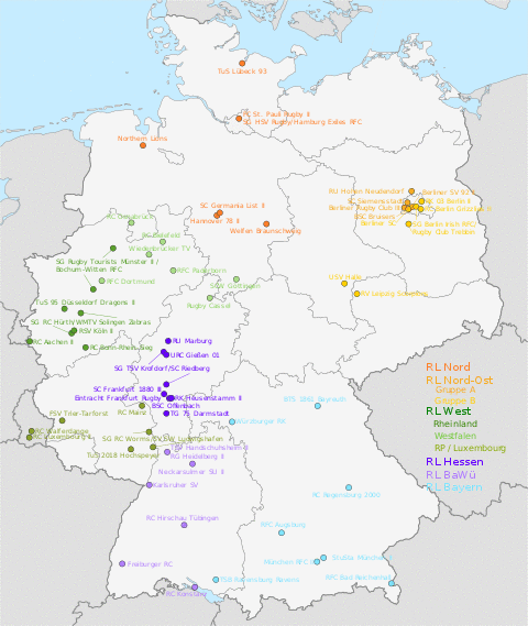 RL North DSV 78 Hannover II • FC St. Pauli II • Northern Lions • SC Germania List II • SG Hamburg Exiles RFC/Hamburger SV • TuS Lübeck 1893 • Welfen Braunschweig | RL North-East Group A | RL West Rhineland Division | RL Hesse BSC Offenbach • Eintracht Frankfurt • RK Heusenstamm II • RU Marburg • SC Frankfurt 1880 III • SG TSV Krofdorf-Gleiberg/SC Riedberg • TG 75 Darmstadt • URC Gießen 01 | RL Baden-Württemberg Freiburger RC • Karlsruher SV • Neckarsulmer SU II • RC Konstanz • RC Hirschau Tübingen • RG Heidelberg II • TSV Handschuhsheim II | RL Bayern BTS 1861 Bayreuth • München RFC II • RC Regensburg 2000 • RFC Augsburg e.V. • RFC Bad Reichenhall • StuSta München II • TSB Ravensburg Raven s • Würzburger RK 2012 e.V. |