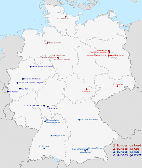 North Bremen 1860 • DRC Hannover • FT Adler Kiel von 1893 • SG SV Odin Hannover/VfR Döhren • TSV Victoria Linden | East Berliner RC II • Berliner SV 1892 e.V. • RC Dresden e.V. • SV Stahl Hennigsdorf • USV Jena • Veltener RC | West Grashof RC Essen • RC Aachen • RSV Köln • Rugby Tourists Münster e.V. • SC Frankfurt 1880 II • TGS Hausen • TuS 95 Düsseldorf | South Heidelberger TV • München RFC • RC Rottweil • RC Unterföhring • SC Neuenheim • StuSta München • Stuttgarter RC • TSV 1846 Nürnberg |