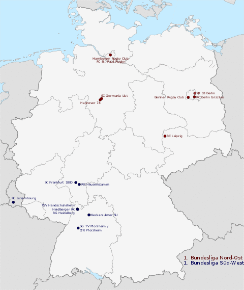 North/East Berlin Grizzlies • Berliner RC • FC St. Pauli • DSV 78 Hannover • Hamburger RC • RC Leipzig • RK 03 Berlin • SC Germania List | South/West Heidelberger RK • RG Heidelberg • Neckarsulmer SU • RC Luxembourg • RK Heusenstamm • SC Frankfurt 1880 • TSV Handschuhsheim • TV 1834 Pforzheim |