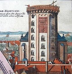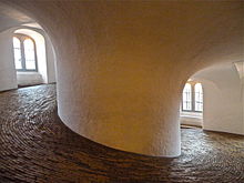 The Round Tower (Danish: Rundetårn), formerly Stellaburgis Hafniens, is a 17th-century tower located in central Copenhagen, Denmark, and one of the many architectural projects of Christian IV of Denmark, built as an astronomical observatory. It is most noted for its equestrian staircase, a 7.5-turn helical corridor leading to the platform at the top (at 34.8 meters above ground), and for the expansive views which it affords over Copenhagen.