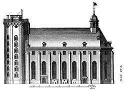 Longomontanus' initial proposal was to erect the new observatory on the top of the hill Solbjerget, now known as Valby Bakke. But since there were also plans for the construction of a new students' church and a library for the university, the idea of merging the three buildings into one grand complex emerged.[2]
