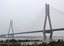 The Runyang Yangtze River Bridge (simplified Chinese: 润扬长江大桥; traditional Chinese: 潤揚長江大橋; pinyin: Rùnyáng Chángjiāng Dàqiáo; Wu: Nye-yaan saon-gaon du-jiau) is a large bridge complex that crosses the Yangtze River in Jiangsu Province, China, downstream of Nanjing. The complex consists of two major bridges that link Zhenjiang on the south bank of the river and Yangzhou on the north. The bridge is part of the Yangzhou–Liyang Expressway. Construction of the bridge complex began in October 2000 and was completed ahead of schedule. The bridge cost 5.8 billion Yuan (about US$700 million). The complex opened to traffic on April 30, 2005. The total length of the bridge complex is about 35.66 kilometres (22.16 mi).[1] In between the two bridges is the island of Shiyezhou.