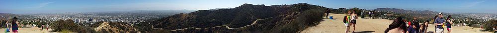 Runyon Canyon Park is a 160-acre (65 ha) park in Los Angeles, California, at the eastern end of the Santa Monica Mountains, managed by the Los Angeles Department of Recreation and Parks.[1] The southern entrance to the park is located at the north end of Fuller Avenue in Hollywood. The northern entrance is off the 7300 block of Mulholland Drive. The Runyon Canyon Road, a fire road that is closed to public motor vehicle access, runs roughly through the center of the park between the northern and southern entrances along Runyon Canyon itself, and there are numerous smaller hiking trails throughout the park.[2] The highest point in the park at an elevation of 1,320 ft (402 m) is known as Indian Rock. Because of its proximity to residential areas of Hollywood and the Hollywood Hills, celebrity sightings are common.[3] The park is also noted for having a fairly liberal dog policy, with dogs allowed off-leash in 90 of the park's 160 acres (0.65 km2).[3][4]