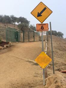 There is another lesser-known route through the bottom of the canyon which starts by the sharp bend in the lower fire road before you reach the tennis court. From here the walker can follow the path past the ruins and over the foundation slab (which is often used as a "ground canvas" for mosaic stone patterns or worded messages spelled out in arranged rocks) and then along what would once have been the river bed, and eventually emerge at the bend at the back of the canyon on Runyon Canyon Road before the final rise up to Clouds Rest. The last bit of this route is a bit of a scramble, and be prepared for cactus, overgrown bushes, insects, and possible snake encounters, but most of the rest of it is less strenuous than the climb between Inspiration Point and Clouds Rest.