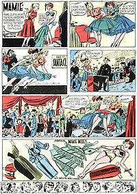 In 1951, Patterson created the cartoon Mamie, a Sunday page for United Feature Syndicate. Mamie was part of a revival of the glamorous "dumb blonde" in comics, in the movies and on the stage.[14] The strip's beautiful lead was lovingly rendered, as was the New York City setting. Patterson added a panel of paper dolls to many of these Sunday comics. Maurice Horn called Mamie an "elegantly drawn, exquisitely composed page", but with "thin" humor, "a flapper strip that had somehow wandered into the wrong decade." Still, it ran until 1956 on the strength of Patterson's art and fashion-sense.[3]