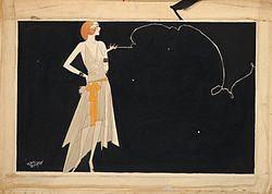 In 1925, having arrived in New York City, Patterson suddenly found his direction. He put aside his fine arts ambitions and turned his talents toward illustration. Drawing on his experience sketching beautiful women in Paris, he began adorning covers and interiors for magazines like College Humor and Judge, and later Life and Ballyhoo with his vivacious flappers. Within a couple of years, Russell Patterson the illustrator went from obscurity to celebrity, at a time when the leading graphic artists were as famous as movie stars. As his career blossomed, his ubiquitous version of the modern Jazz Age woman graced the covers and interior pages of The Saturday Evening Post, Vogue, Vanity Fair, Cosmopolitan, Redbook and Photoplay, among many other magazines. As celebrated at that time as the "Gibson Girl" had been years before,[3] his "Patterson Girl" was, in the words of Armando Mendez, "simultaneously brazen and innocent."[1] By incorporating the day's faddish "raccoon coats and flapping, unbuckled galoshes in his drawings, Patterson became a pacemaker in setting styles."[4] Women of the time turned to Patterson's work to follow trends in clothing, jewelry and cosmetics. Martha H. Kennedy cites Patterson's dependence on the "graphic power of elegant, outlined forms, linear patterns of clothing and trailing smoke to compose strongly decorative, eye-catching designs."[5]