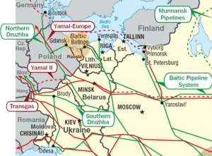 The Russia–Belarus energy dispute began when Russian state-owned gas supplier Gazprom demanded an increase in gas prices paid by Belarus, a country which has been closely allied with Moscow and forms a loose union state with Russia. It escalated on 8 January 2007, when the Russian state-owned pipeline company Transneft stopped pumping oil into the Druzhba pipeline which runs through Belarus because Belarus was siphoning the oil off the pipe without mutual agreement.[1] [2] On 10 January, Transneft resumed oil exports through the pipeline after Belarus ended the tariff that sparked the shutdown, despite differing messages from the parties on the state of negotiations.[3][4]