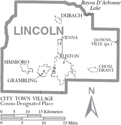 In 1934, the historian Robert W. Mondy of Louisiana Tech University in Ruston completed a thesis entitled "A History of Lincoln Parish, Louisiana" as part of the requirements for his master of arts degree from the University of Texas at Austin.[6] Another Louisiana Tech faculty member, Robert C. Snyder, was instrumental in the establishment in 1962 of the Lincoln Parish Library. He served as the library board president for many years.[7]