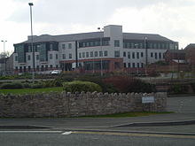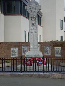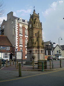 Ruthin (/ˈrɪθɪn/ RITH-in; Welsh: Rhuthun) is the county town of present-day Denbighshire in Wales and a community in the southern part of the Vale of Clwyd. The older town, the castle and St Peter's Square lie on a hill, but many newer parts are in the flood plain of the River Clwyd. This caused multiple problems in the late 1990s – flood-control works costing £3 million were completed in the autumn of 2003.[3] Ruthin is skirted by villages such as Pwllglas and Rhewl. The name comes from the Welsh words rhudd (red) and din (fort), reflecting the colour of the sandstone bedrock,[4] of which the castle was built in 1277–1284. The original name was Castell Coch yng Ngwern-fôr (Red Castle in the Sea Swamps). The mill is nearby. Maen Huail is a registered ancient monument attributed to the brother of Gildas and King Arthur, located outside Barclays Bank in St Peter's Square.