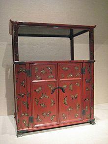 An office to supervise lacquerware craftsmen was established as Kaizuri bugyōsho (貝摺奉行所).[1] According to "Ryūkyūkoku yuraiki (琉球国由来記)", or the Official Chorography of Ryūkyū published in 1713, it was during 17th century that Kaizuribugyōsho focused on introducing technology from China and Satsuma.[2] Since 1686 entries of lacquer trees cultivation as well as harvest of lacquer juice was recorded in Kishaba Monjo (喜舎場文書), with evidence on mairi tsukawashijō.[3] Thus the Ryūkyū government managed and encouraged lacquerware production from lacquer juice harvest[4][5] It was during 1800s when Kaizuri Bugyōsho supervised export of Ryukyuan lacquerware with tsuishu suikin techniques.[6]