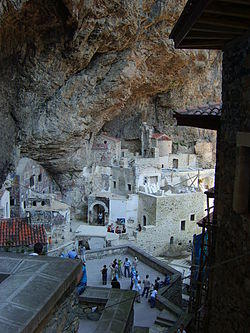 Sumela Monastery (Greek: Μονή Παναγίας Σουμελά, Moní Panagías Soumelá; Turkish: Sümela Manastırı) is a Greek Orthodox monastery dedicated to the Virgin Mary located at Karadağ (Greek: Sou Melá, meaning "Black Mountain")[2] within the Pontic Mountains, in the Maçka district of Trabzon Province in modern Turkey.