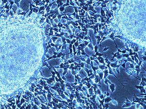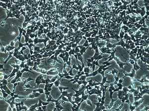 The cells typically grow in tissue culture in two distinct ways. Some grow into clumps of cells which float in the media, while others form clumps which stick to the dish. SH-SY5Y cells can spontaneously interconvert between two phenotypes in vitro, the neuroblast-like cells and the Epithelial like cells, although the mechanisms underlying this process are not understood. However, the cell line is appreciated to be N-type (neuronal), given its morphology and the ability to differentiate the cells into along the neuronal lineage (in contrast to the S-type SH-EP subcloned cell line, also derived from SK-N-SH).[3] Cells with short spiny neurite-like processes migrate out from these adherent clumps. SH-SY5Y cells possess an abnormal chromosome 1, where there is an additional copy of a 1q segment and is referred to trisomy 1q. SH-SY5Y cells are known to be dopamine beta hydroxylase active, acetylcholinergic, glutamatergic and adenosinergic. The cells have very different growth phases, outlined in the surrounding pictures. The cells both propagate via mitosis and differentiate by extending neurites to the surrounding area. While dividing, the aggregated cells can look so different from the differentiated cells following the K'annul-index tumor cellularity (TNF, for Tumor Necrosis Factor), that new scientists often mistake one or the other for contamination. The dividing cells can form clusters of cells which are reminders of their cancerous nature, but certain treatments such as retinoic acid, BDNF, or TPA can force the cells to dendrify and differentiate. Moreover, induction by retinoic acid results in inhibition of cell growth and enhanced production of noradrenaline from SH-SY5Y cells [4][5]