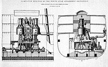 As with nearly all White Star ships Britannic was built at Harland & Wolff, Belfast. She was built at a cost of £200,000 (equivalent to £18,710,000 in 2019),[2][3] Britannic was the first White Star ship to sport two funnels. She was primarily steam powered but, as was common for steamships of the era, was fitted with auxiliary sails, and was rigged as a four masted barque. She was powered by two compound reciprocating engines, which could produce 4,970 ihp, and could propel the ship via a single screw to a maximum speed of 16 knots (30 km/h; 18 mph). As Harland & Wolff had not yet gained an expertise in building steam engines, the engines were supplied by Messrs Maudslay, Sons & Field of Lambeth. Britannic's hull was subdivided into eight watertight compartments by nine watertight bulkheads.[3]
