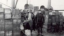 The islanders took a different view of salvage and considered that they did not "steal" any cargo from local wrecks, but instead talked of "saving" or "rescuing" it from the sea.[49] They knew Politician had been abandoned by the owners and the salvage crews; one islander later told Swinson "when the salvors quit a ship—she's ours".[52] Once the salvage crew had left the Politician, islanders from across the Hebrides, as well as boats from Scotland's west coast, engaged in what Hutchinson calls the "wholesale rescuing" of the whisky. They were aided in navigating round the wreck by Angus John Campbell, a local man who had served as boatswain on Politician between the wars.[17] Wartime rationing had led to shortages of the spirit, and what supplies were made available were increasingly expensive because of rising duty.[k] For several nights, the islanders worked on hooking the crates out of the oil-and-seawater-filled hold; every night between 20 and 50 men were on the wreck working to remove the whisky. As the contents being raised were covered in oil, the men's clothes were soon covered, and many began to use their wives' dresses to cover their own clothes.[54]