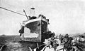 Soldiers of the Australian 2nd Infantry Brigade disembarking at V Beach on 6 May 1915, for the Second Battle of Krithia. River Clyde is beached and serving as a quay. The light coloured patch on her starboard bow is part of her unfinished yellow camouflage.