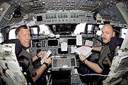 Dominic Pudwill Gorie, STS-108 commander, and pilot Mark Kelly are in their respective stations during rendezvous operations with the ISS. Pudwill Gorie brought Endeavour to a gentle linkup with the ISS as the two craft sailed over England.