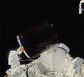 The orbiter then began a series of maneuvers to meet up with the first of the two satellites to be recovered, Palapa B2. The orbits of both satellites had been lowered by ground commands from about 600 miles (970 km) to 210 miles (340 km) to facilitate recovery operations. On day five of the mission, Discovery rendezvoused with Palapa. Mission specialists Allen and Gardner performed an EVA, capturing the satellite with a device known as a "Stinger" (Apogee Kick Motor Capture Device,[3] ACD), which was inserted into the satellite's apogee motor nozzle by Allen. The satellite's rotation was slowed to 1 RPM, and Gardner, operating from a position on the end of the RMS, attempted unsuccessfully to grapple the satellite. Allen was able to manually maneuver the satellite into its cradle with Gardner's help, further aided by the RMS, which was operated by Fisher. The successful, improvised rescue effort took two hours.