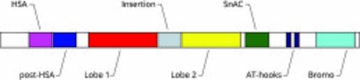 Electron microscopy studies of SWI/SNF and RSC (SWI/SNF-B) reveal large, lobed 1.1-1.3 MDa structures.[27][28][29][30] These structures resemble RecA and cover both sides of a conserved section of the ATPase domain. The domain also contains a separate domain, HSA, that is capable of binding actin, and resides on the N-terminus.[4] The bromo domain present is responsible for recognizing and binding lysines that have been acetylated.[6] No atomic-resolution structures of the entire SWI/SNF complex have been obtained to date, due to the protein complex being highly dynamic and composed of many subunits. However, domains and several individual subunits from yeast and mammals have been described. In particular, the cryo-EM structure of the ATPase Snf2 in complex with a nucleosome shows that nucleosomal DNA is locally deformed at the site of binding.[31] A model of the mammalian ATPase SMARCA4 shows similar features,[23] based on the high degree of sequence homology with yeast Snf2. The interface between two subunits, BAF155 (SMARCC1) and BAF47 (SMARCB1) was also resolved, providing important insights into the mechanisms of the SWI/SNF complex assembly pathway.[32]