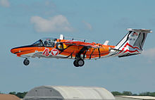 Early on, the Swedish Air Force had formed a commitment with Saab that, contingent upon satisfactory performance of the prototype during flight testing, that an order for at least 100 aircraft would be placed.[8][9] In December 1961, the Swedish Government announced that it had authorized the Swedish Air Force to sponsor the development and manufacture of a single prototype Saab 105 in a training configuration.[10] On 29 June 1963, this first prototype conducted its maiden flight.[11] The flight test program soon revealed the type to have good handling qualities and to be capable of performing aerobatic maneuvers.[12] In March 1965, a single prototype was dispatched to Turbomeca's facilities in Pau, Pyrénées-Atlantiques, Aquitaine, France, for further flight testing of its Turbomeca Aubisque powerplant.[13]