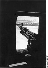 On the ground, Saarbrücken was defended by the 347th Infantry Division commanded by Wolf-Günther Trierenberg in 1945.[22] The US 70th Infantry Division was tasked with punching through the Siegfried Line and taking Saarbrücken. As the fortifications were unusually strong, it first had to take the Siegfried Line fortifications on the French heights near Spicheren overlooking Saarbrücken. This Spichern-Stellung had been constructed in 1940 after the French had fallen back on the Maginot Line during the Phoney War. The 276th Infantry Regiment attacked Forbach on 19 February 1945, and a fierce battle ensued, halting the American advance at the rail-road tracks cutting through Forbach on 22 February 1945.[23] The 274th and 275th Infantry Regiments took Spicheren on 20 February 1945.[23] When the 274th Infantry Regiment captured the Spicheren Heights[23] on 23 February 1945, after a heavy battle on the previous day, the Germans counter-attacked for days, but by 27 February 1945, the heights were fully under American control.[24] A renewed attack on 3 March 1945, allowed units of the 70th Infantry Division to enter Stiring-Wendel and the remainder of Forbach. By 5 March 1945, all of Forbach and major parts of Stiring-Wendel had been taken. However, fighting for Stiring-Wendel, especially for the Simon mine, continued for days.[23] After the German defenders of Stiring-Wendel fell back to Saarbrücken on 12 and 13 March 1945,[25] the 70th Infantry Division still faced a strong segment of the Siegfried Line, which had been reinforced[26] around Saarbrücken as late as 1940. After having the German troops south of the Saar fall back across the Saar at night, the German defenders of Saarbrücken retreated early on 20 March 1945. The 70th Infantry Division flanked Saarbrücken by crossing the Saar north-west of Saarbrücken. The 274th Infantry Regiment entered Saarbrücken on 20 March 1945, fully occupying it the following day, thus ending the war for Saarbrücken.[25]