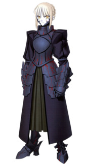 In the Heaven's Feel route of Fate/stay night, Saber is consumed by the Holy Grail during a battle with True Assassin and becomes a stronger, corrupted version of her former self, known as Saber Alter, and a Servant under Sakura Matou, the heroine of this route.[19] While Shirou is on his way to seek an alliance with Ilya and Berserker, Saber appears in her Alter form and defeats Berserker, making herself known to Shirou while nearly killing her former allies. Shirou returns to Illya's home and defeats Berserker, who is now working for Sakura. Saber approaches the weakened Shirou but refuses to kill him, since she feels honored by his recent fight.[19] In the Normal End and True End, Sakura orders Saber to kill Shirou and the servant Rider. However, the duo manages to overpower Saber, with Shirou killing his former comrade.[20]