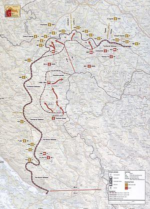 The Saborsko Independent Company, consisting of approximately 30 personnel, was stationed in the village by the Croatian police the day after the Plitvice Lakes incident on 1 April 1991.[17] The tensions worsened in July. That month the JNA distributed 1,000 small arms to ethnic Serbs living in Gorski kotar region, including Plaški. Skirmishes took place near Josipdol and Plaški.[18] In June–August, Saborsko was targeted by artillery and mortars positioned at JNA barracks in Lička Jasenica, and the bulk of its civilian population fled by early August. However, approximately 400 returned to their homes the same month after 20–30 special police troops were deployed from Duga Resa to Saborsko along with 15–20 regular police drawn from Slunj as reinforcements.[19] On 25 September, 100–200 police reservists arrived to Saborsko from Zagreb. The final Croatian reinforcements arrived in October, consisting of 20–50 police.[20] By October, a pocket of Croatian-controlled territory formed around the town of Slunj south of Karlovac, on the boundary of the regions of Kordun and Lika, hampering direct communications between SAO Krajina-held areas in the two regions.[21] The pocket was separated from the bulk of the Croatian Government-controlled territory by the SAO Krajina-controlled town of Plaški to the west. In turn, Plaški was inaccessible to the central SAO Krajina authorities as the road to Plaški ran through the village of Saborsko, situated within the Slunj pocket.[18]