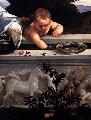 The carved scenes on the front face of the trough/sarcophagus do not yet have a generally agreed reading.[13] They were described by Edgar Wind as "A man is being scourged, a woman dragged by the hair, and an unbridled horse is led away by the mane", all perhaps images of the taming of the passions.[14] Alternatively they have been seen as (reading right to left): Adam and Eve standing beside the Tree of Knowledge, Cain killing Abel, and the Conversion of Saint Paul, shown falling off his horse.[15] By 1914 they had been claimed to derive from scenes in five different literary works, ancient and modern,[16] reflecting the 19th-century taste for finding literary sources for paintings. They have been connected with the woodcut illustrations to Francesco Colonna's Hypnerotomachia Poliphili (published in Venice in 1499).[10]
