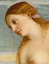 Scholars have proposed several identifications of the figures, and analyses and interpretations which largely flow from these. The concept of Geminae Veneres or "Twin Venuses", a dual nature in Venus, was well developed in both classical thought and Renaissance Neoplatonism, with the earthly Aphrodite Pandemos, representing carnal love and beauty, and the heavenly Aphrodite Urania representing a higher and more spiritual love, using the classical terms for the figures. Erwin Panofsky and others found both in the painting, with the earthly Venus the nude one.[21] Others see the clothed figure as representing the bride (idealized, and not a portrait, which would have been rather indecorous in Venice), and only the nude figure representing Venus. For Edgar Wind the theme was "an initiation of Beauty [at left] into Love".[22]