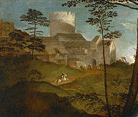 A religious painting of the same period, that has many similarities in style is the Noli me tangere, probably also of 1514 (National Gallery), in which Titian uses much the same group of buildings as at the left here, but reversed and without the tower. These develop from the group in the Dresden Venus.[25]