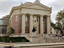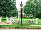 The village of Sag Harbor is in the Towns of both Southampton and East Hampton. The dividing line is Division Street, known as Town Line Road just south of the village. Most of the defining 19th-century landmarks of the village — including its Main Street, Old Whaler's Church, John Jermain Memorial Library, Whaling Museum, Custom House, the Old Burying Ground, Oakland Cemetery, Mashashimuet Park, and Otter Pond are in Southampton. However, almost all of the Bay Street marina complex, including Sag Harbor Yacht Club and Breakwater Yacht Club, at the foot of Main Street, is in East Hampton. Also there are the village's high school, the Sag Harbor State Golf Course, and the historic freedmen's community of Eastville, first developed in the early 1800s.[12]