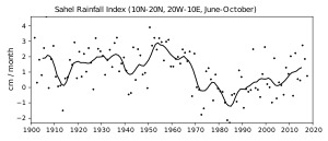 A 2006 study by NOAA scientists suggests that the Atlantic Multidecadal Oscillation plays a leading role. An AMO warm phase strengthens the summer rainfall over Sahel, while a cold phase reduces it.[33] The AMO entered a warm phase in 1995 and, assuming a 70-year cycle (following peaks in ≈1880 and ≈1950), will peak around 2020.[34] A 2009 study found further evidence for a link between the AMO and West African drought.[3] Later, a 2013 study[35] found that the East Atlantic (EA) mode also modulates Sahel summer rainfall and further indicated that operational climate forecasting was unable to capture this EA impact on the Sahel.
