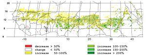 Since the 1980s, summer rainfall in the Sahel has been increasing; this has been associated with an increase in vegetation, forming what has been called a 'greening' of the Sahel. The observed increase in rainfall is accounted for by enhancements in the African easterly jet, which is known to induce wet anomalies. A 2011 study found that the positional shifts in the African easterly jet and African easterly waves accompanied the northward migration of the Sahel rainband.[5]